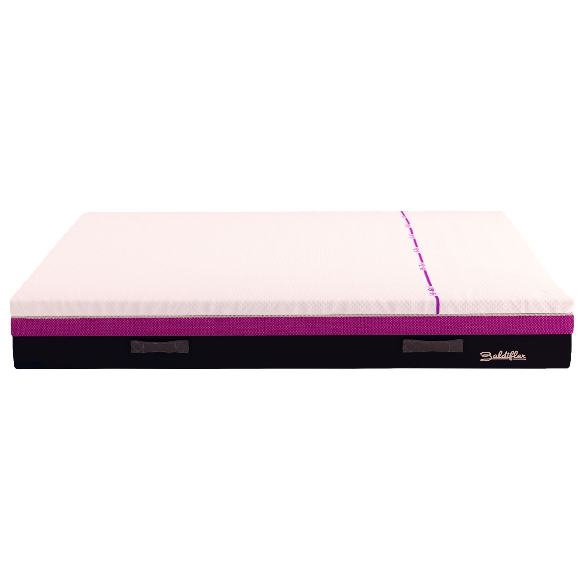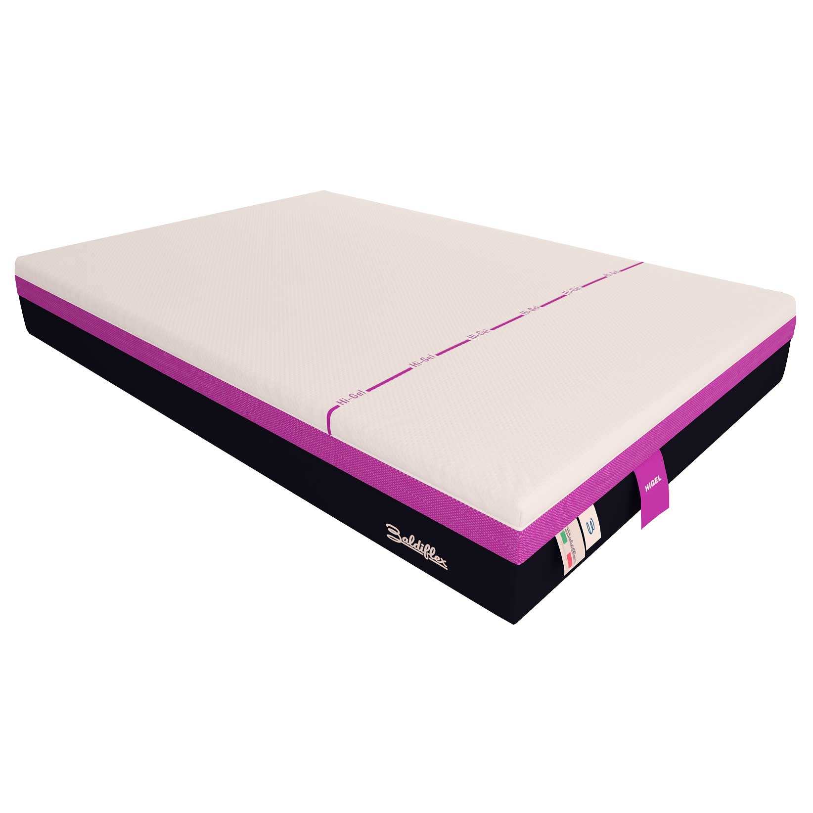 Il materasso HiGel è alto 25 cm, ha una rigidità alta ed è realizzato con 5 cm in memory, gel e l'innovativa schiuma Superflex HD. HiGel è in grado di abbassare la temperatura del corpo disperdendone il calore e mantenendolo sempre fresco. Migliora la sensazione di benessere e freschezza durante il riposo. La particolare superficie 3D delle zone in HiGel consente un adattamento unico e personalizzato al corpo, offrendo così una risposta accogliente ma di sostegno. La fodera, con maniglie e zip, è rimovibile e lavabile. Tutte le materie prime scelte sono anallergiche e anti-acaro, certificate Oeko-Tex. Si ricorda che di base questo prodotto ha una rigidità più alta di un altro modello di materasso proprio perché le sue caratteristiche tecniche non rispondono alla temperatura che lo circonda e tanto di più risponderanno in maniera più graduata anche alla temperatura della persona quando lo utilizzerà. Si adatta molto bene a chi dorme molto spesso a pancia in su che in realtà sarebbe la posizione classica da adottare in fase di riposo.