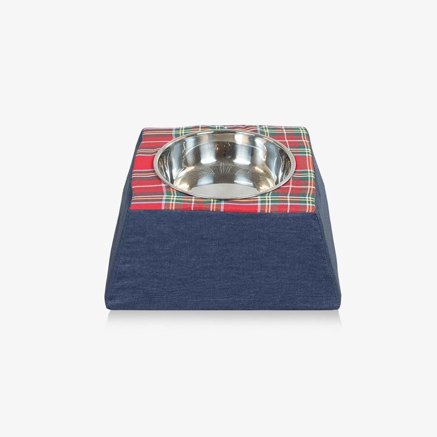 It is made with a rubber support covered by an elegant Scottish pattern fabric. The bowl is removable for easy washing.