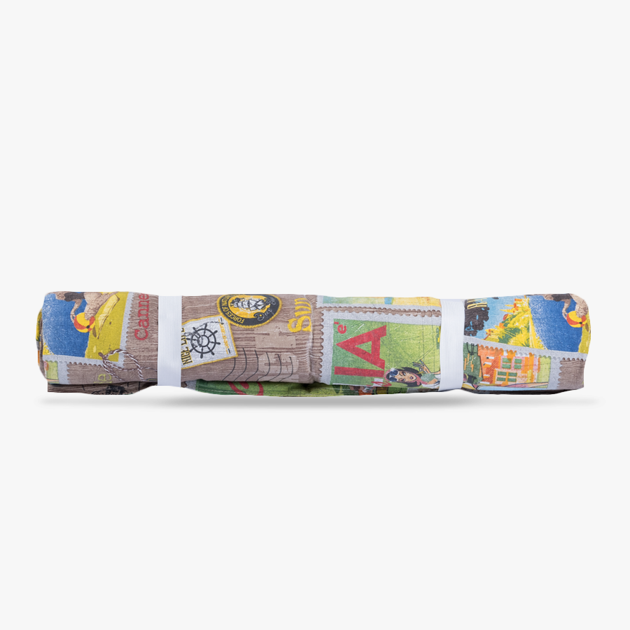 - Rectangular, foldable and rollable, with a colorful postcard pattern