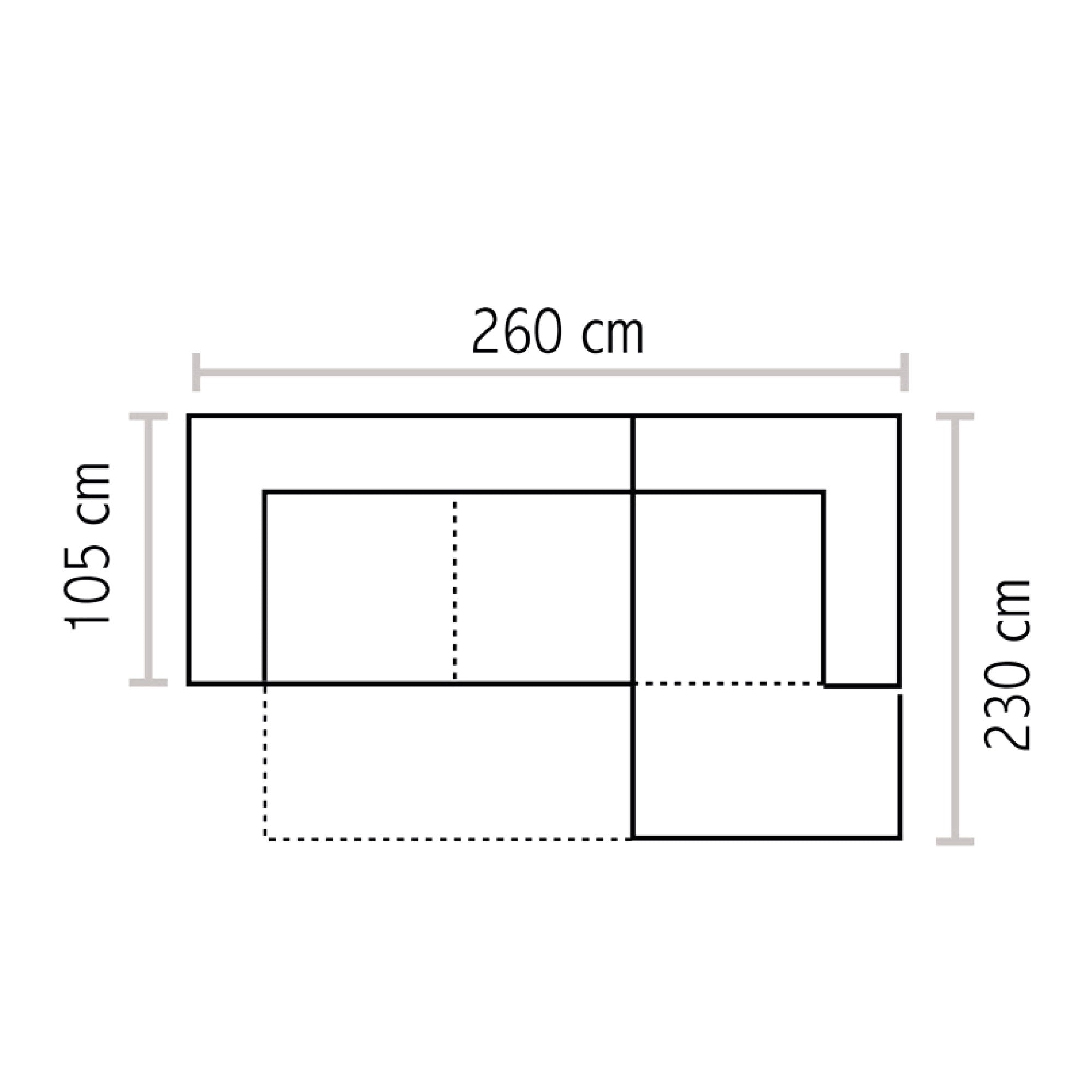 • Short side length 105 cm (armrest side) - total sofa width 260 cm - peninsula side length 230 cm