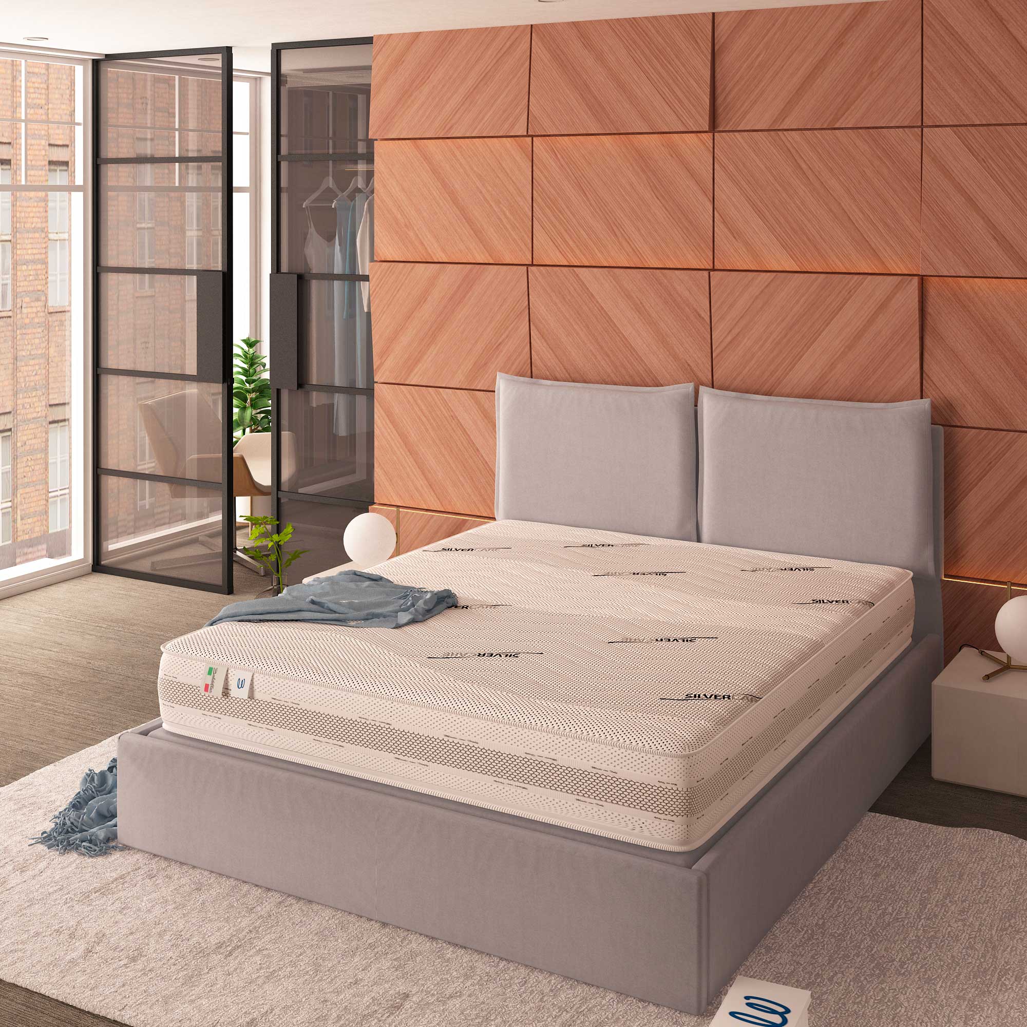 • baldiflex materasso extra-rigido king kong con fodera silver care visto di trequarti da sinistra, foto ambientata su letto imbottito
