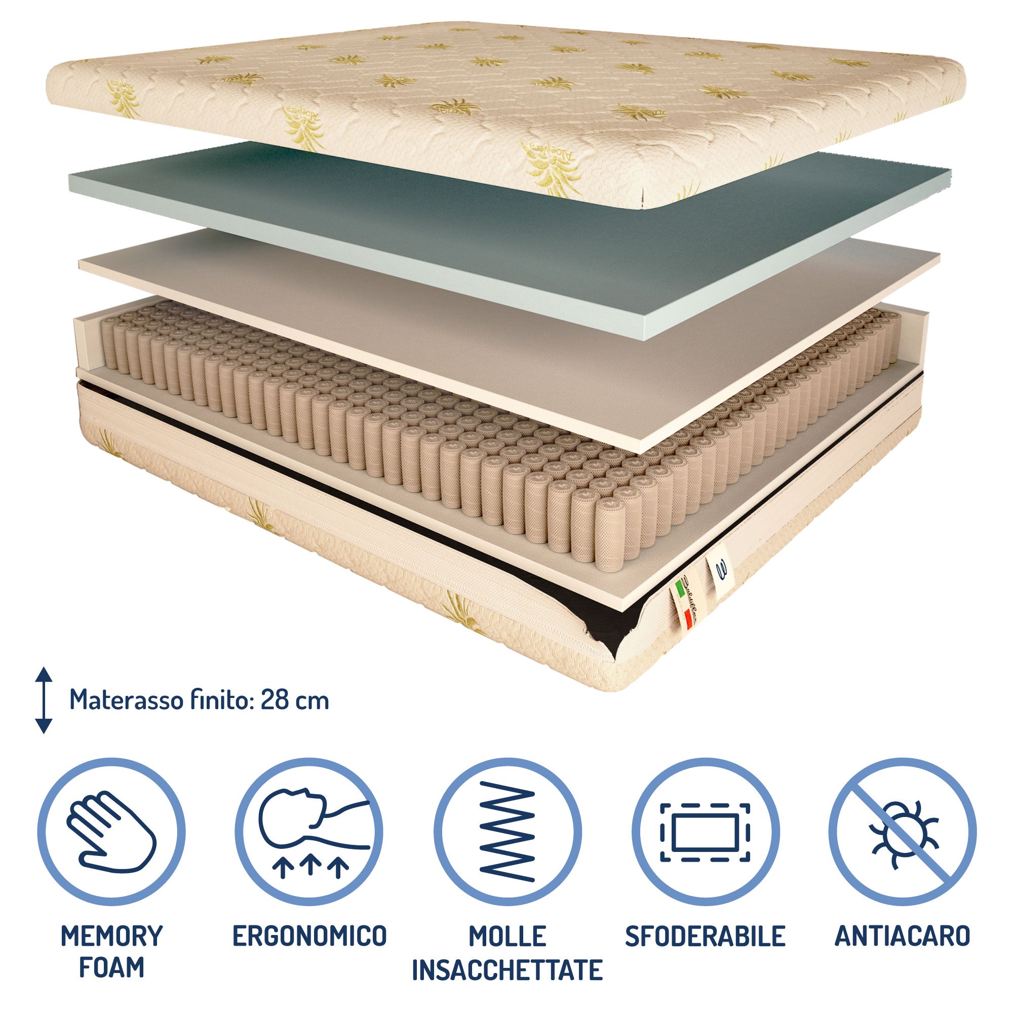 The mattress is made up of 700 pocket springs each with a diameter of 6.5 cm (which obviously vary in quantity depending on the mattress size) and a polyurethane box or casing that contains them. The reason they are called pocket springs is that each spring is actually inserted inside a TNT bag, giving them a characteristic very different from the old springs we used to know, and moreover, which is absolutely not trivial, they are protected from dust and moisture, giving this type of mattress, now far from traditional, a much more innovative value both in sensation and in freshness and breathability. It is 28 cm high and has medium firmness. It is ideal for those looking for a mattress with good support from the 700 pocket springs and the comfort of 6 cm memory foam. The combination of this number of springs and the thickness of the memory foam applied on top allows for an excellent product that offers value for price and technical quality for its performance. Perfect for those who sleep on their stomach and side, it ideally adapts to the shape of the body.
