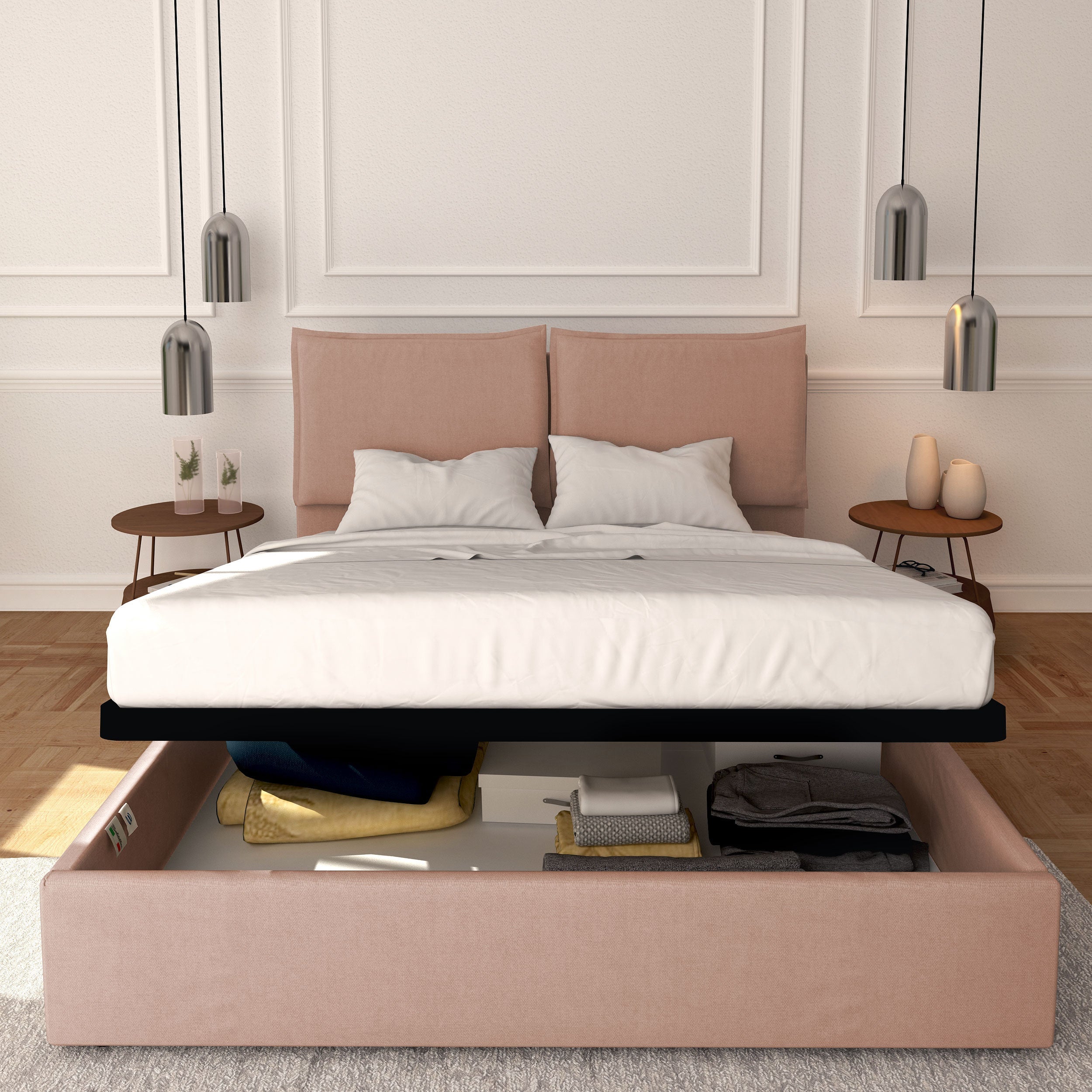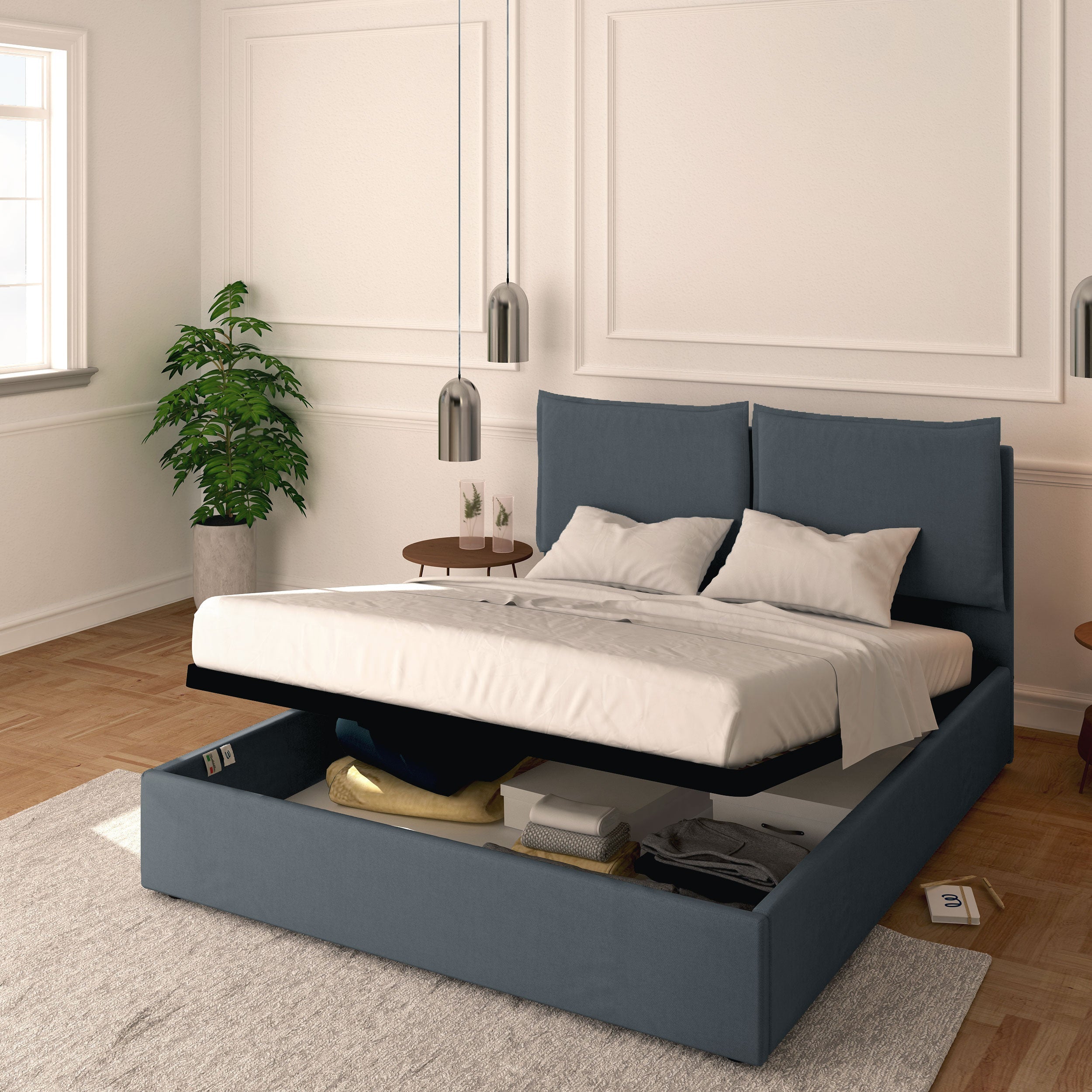 King size / queen size storage bed in removable fabric Licia + Bros 1600 spring mattress + Mattress protector
