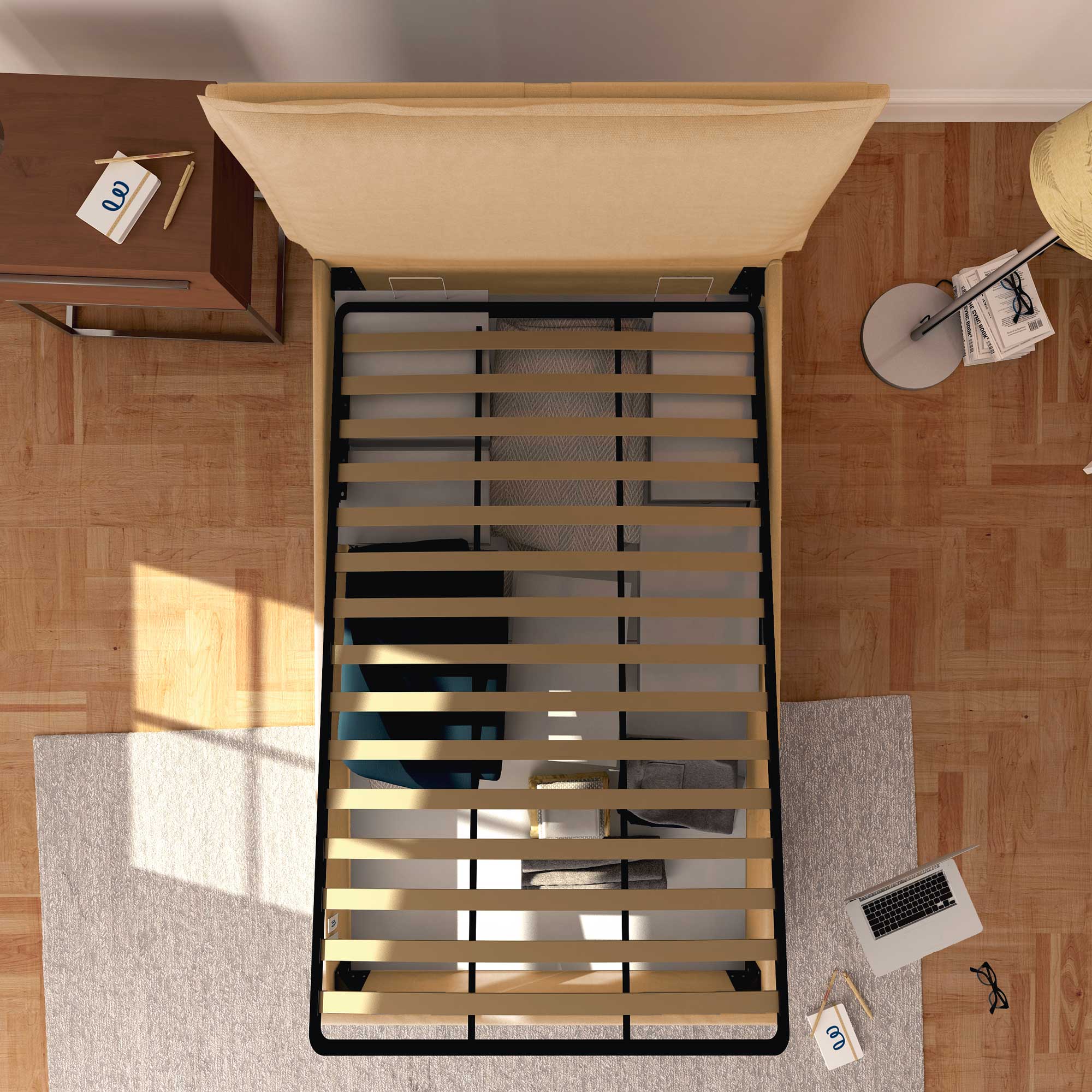 Grâce au revêtement en simili cuir ignifuge certifié, il est idéal pour les chambres d'hôtel, B&B, gîtes ruraux et établissements d'accueil souhaitant garantir une sécurité maximale à leurs clients sans renoncer au style. Le matériau est résistant, facilement désinfectable et parfait pour une utilisation intensive. Le pratique conteneur gain de place avec ouverture frontale permet d'optimiser les espaces et de ranger aisément le linge ou les coussins de rechange. Le sommier à lattes en bois assure confort et solidité même pour un usage prolongé.