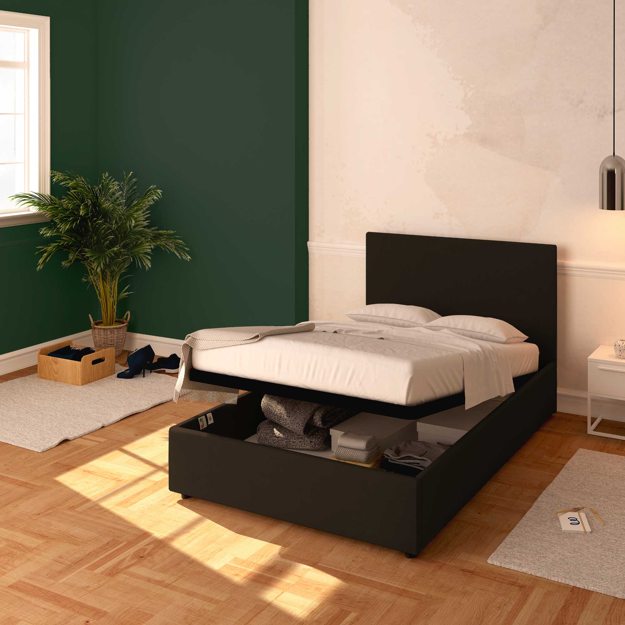 Le lit coffre une place et demie en simili cuir déhoussable Rossano permet d'exploiter l'espace sous le lit pour ranger couvertures, draps, couettes, vêtements et boîtes. Le sommier et le matelas se soulèvent facilement grâce à la poignée de prise. Le lit coffre est livré à domicile à monter, accompagné de simples instructions à suivre.