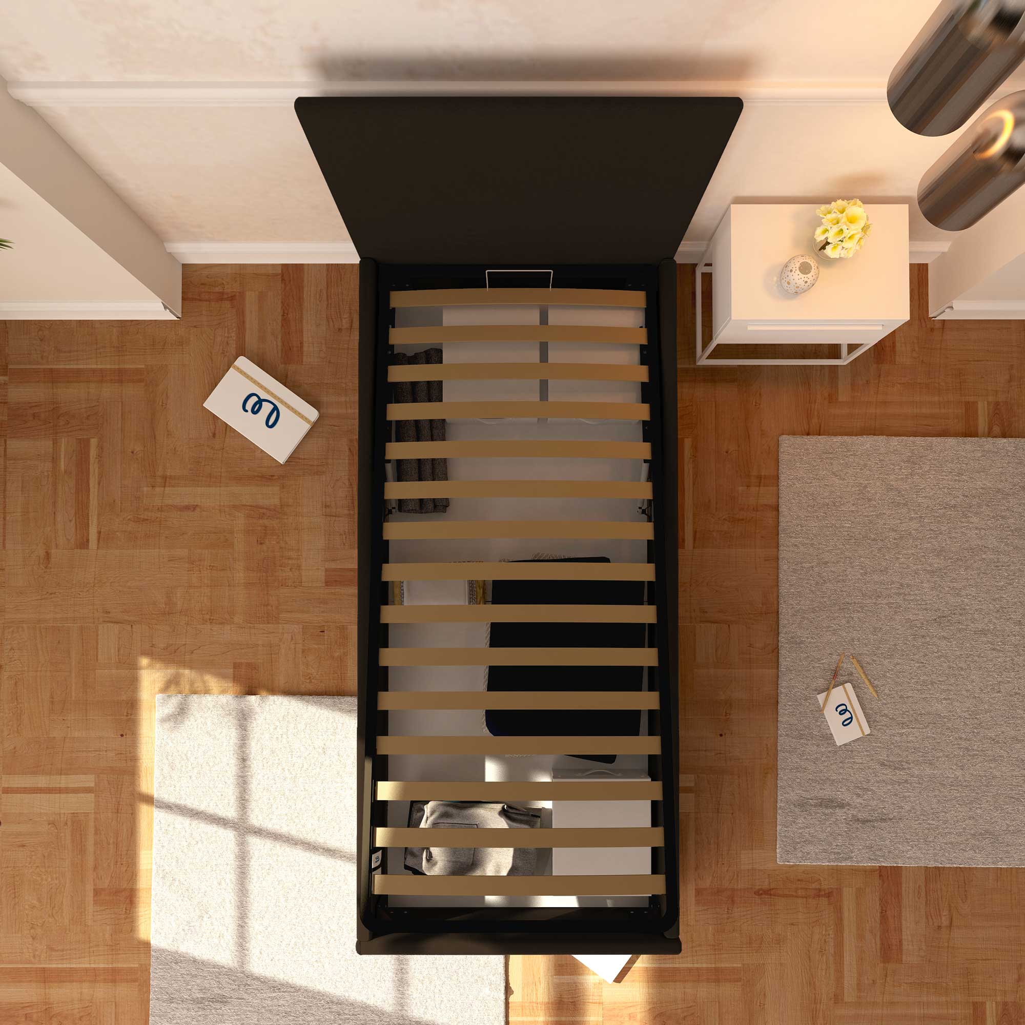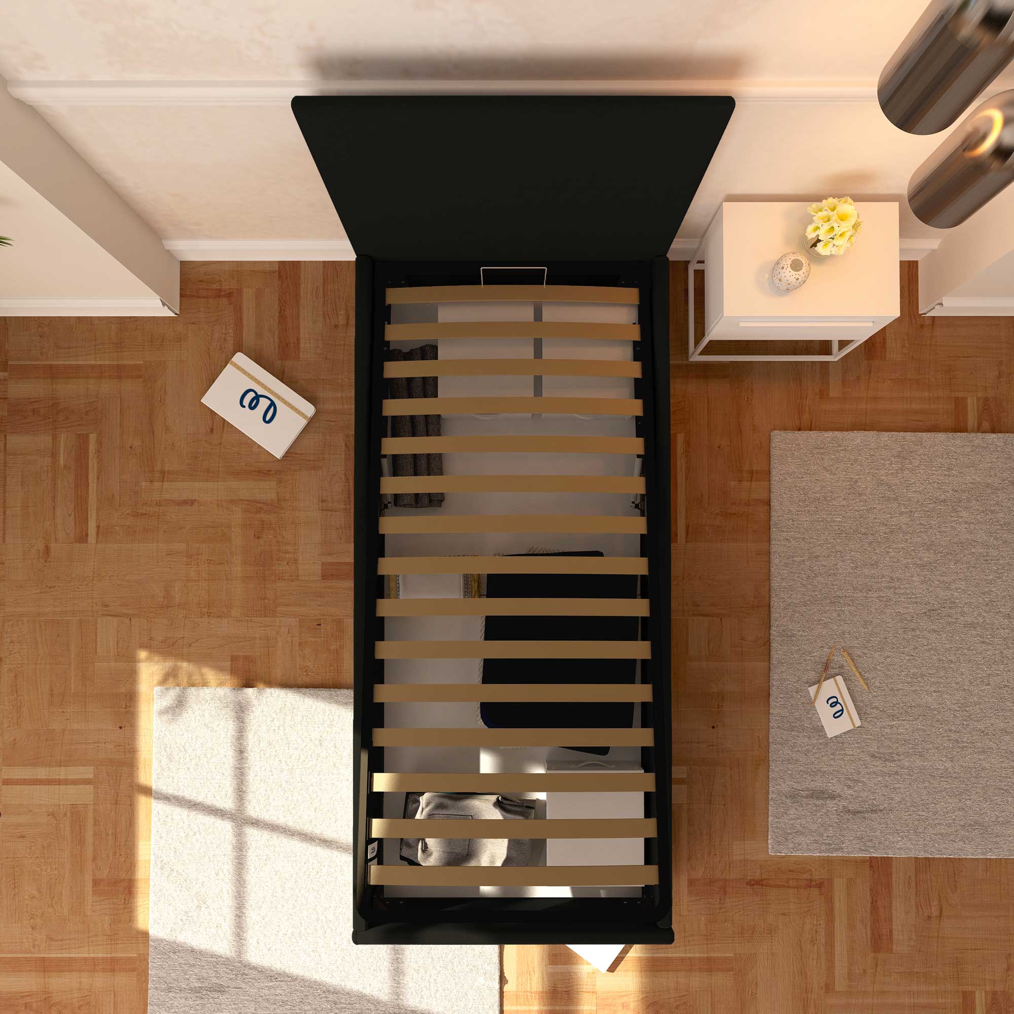 Le lit coffre simple en simili cuir déhoussable Rossano permet d'exploiter l'espace sous le lit pour ranger couvertures, draps, couettes, vêtements et boîtes. Le sommier et le matelas se soulèvent facilement grâce à la poignée. Le lit coffre est livré à monter soi-même, accompagné de simples instructions à suivre.