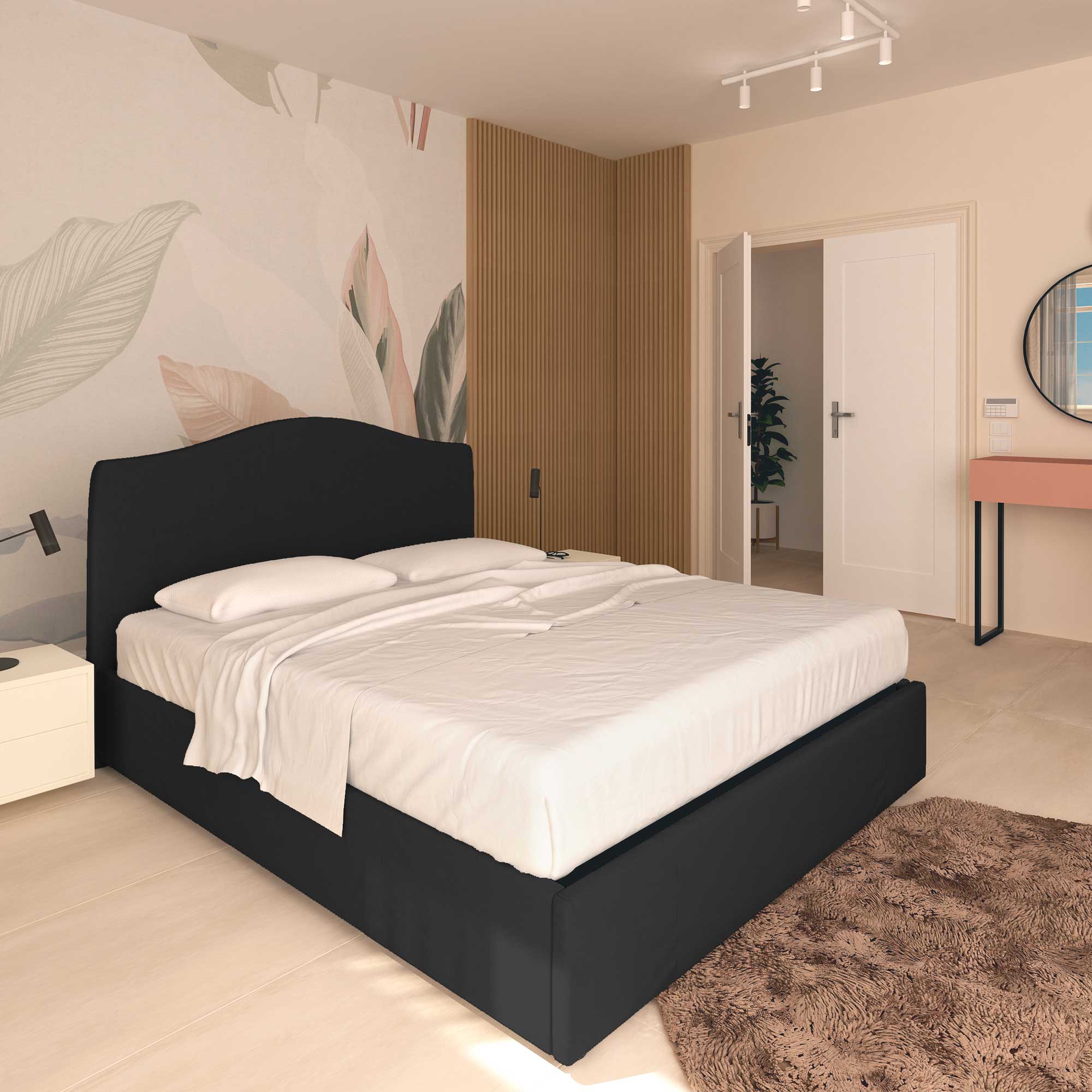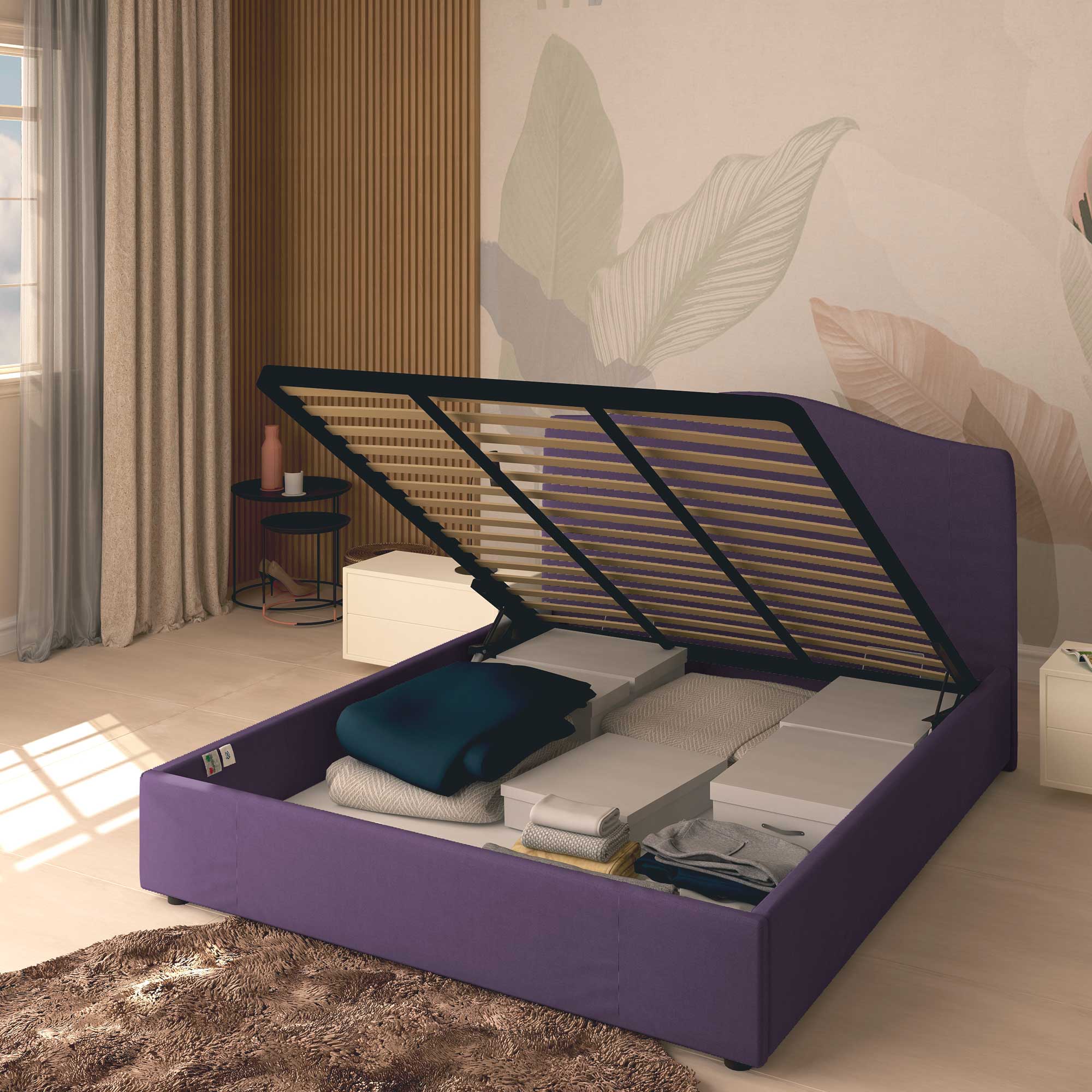 Le lit coffre double en tissu Vittoria permet d'exploiter l'espace sous le lit pour ranger couvertures, draps, couettes, vêtements et boîtes. Le sommier et le matelas se soulèvent facilement grâce à la poignée de prise. Le lit coffre est livré à domicile à monter, accompagné de simples instructions à suivre.