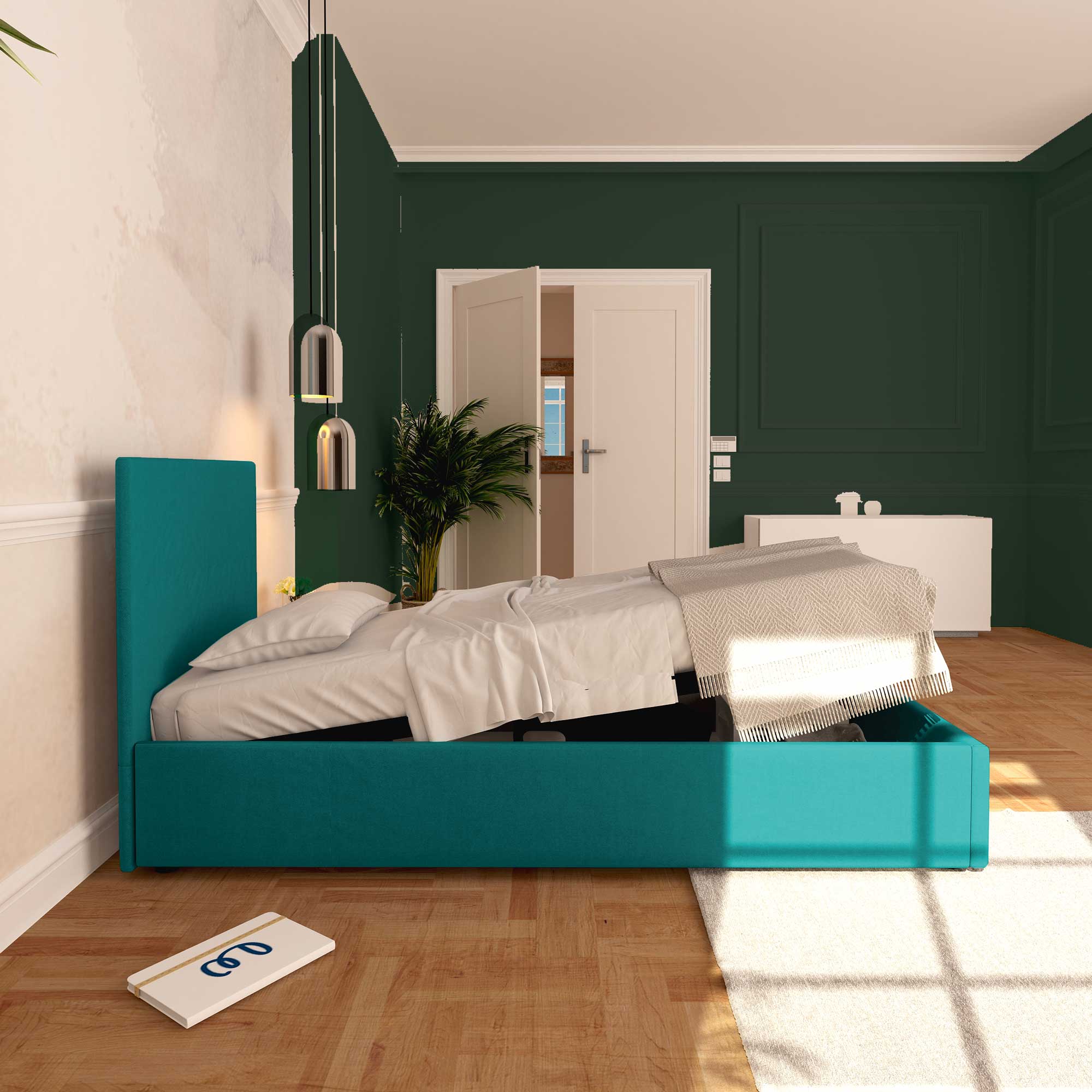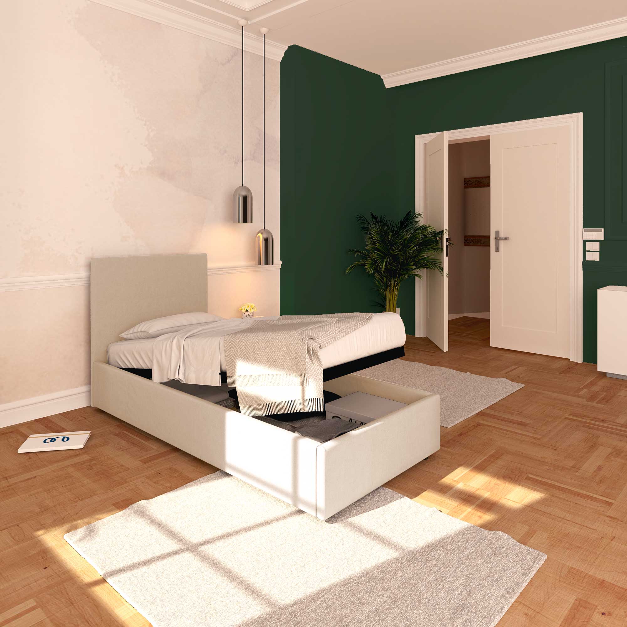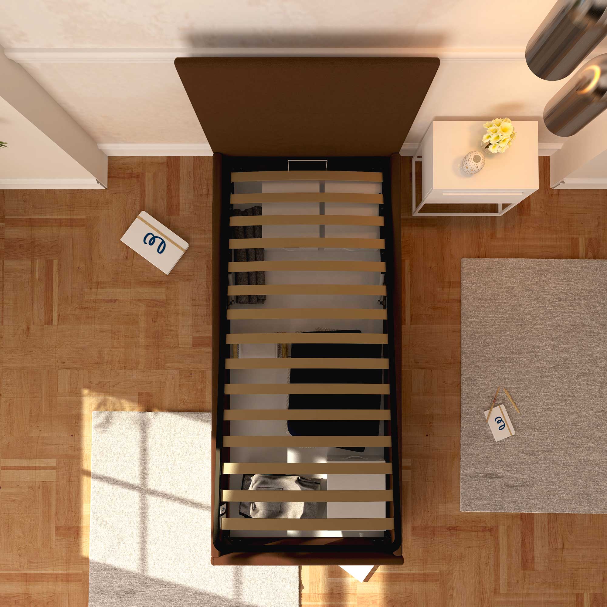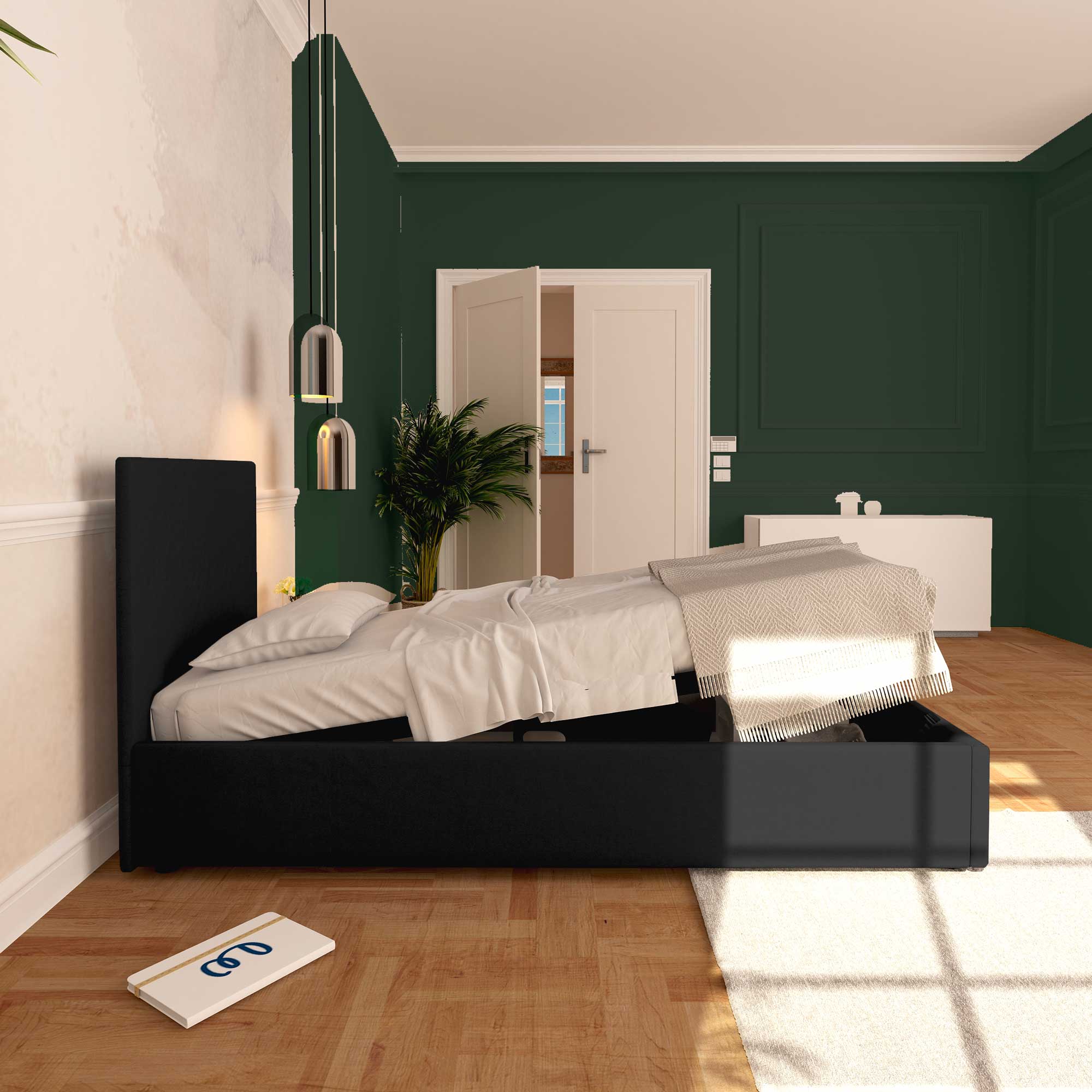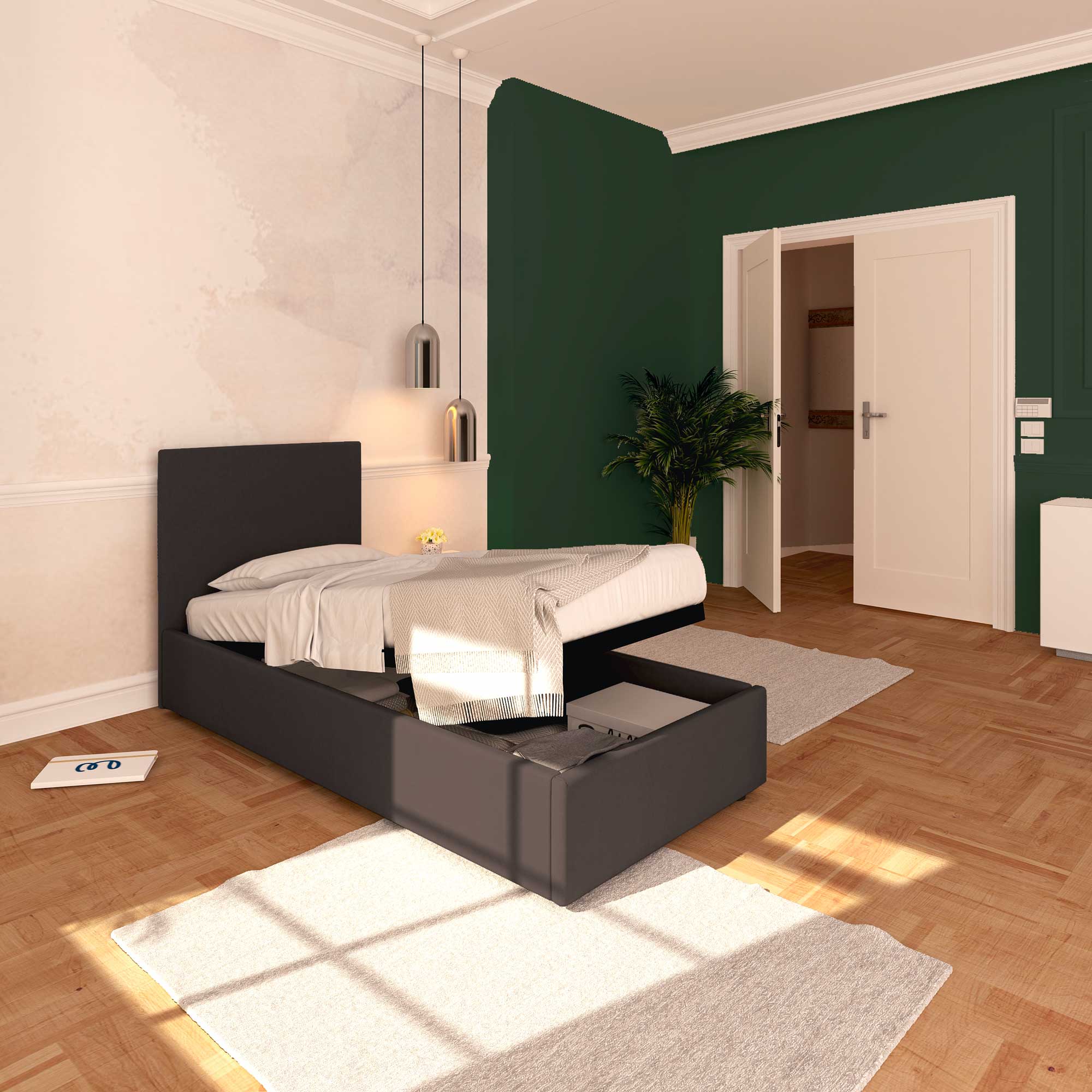 Le lit coffre Rossano permet d'exploiter l'espace sous le lit pour ranger couvertures, draps, couettes, vêtements et boîtes. Le sommier et le matelas se soulèvent facilement grâce à la poignée. Le lit est livré à domicile à monter, accompagné de simples instructions à suivre.