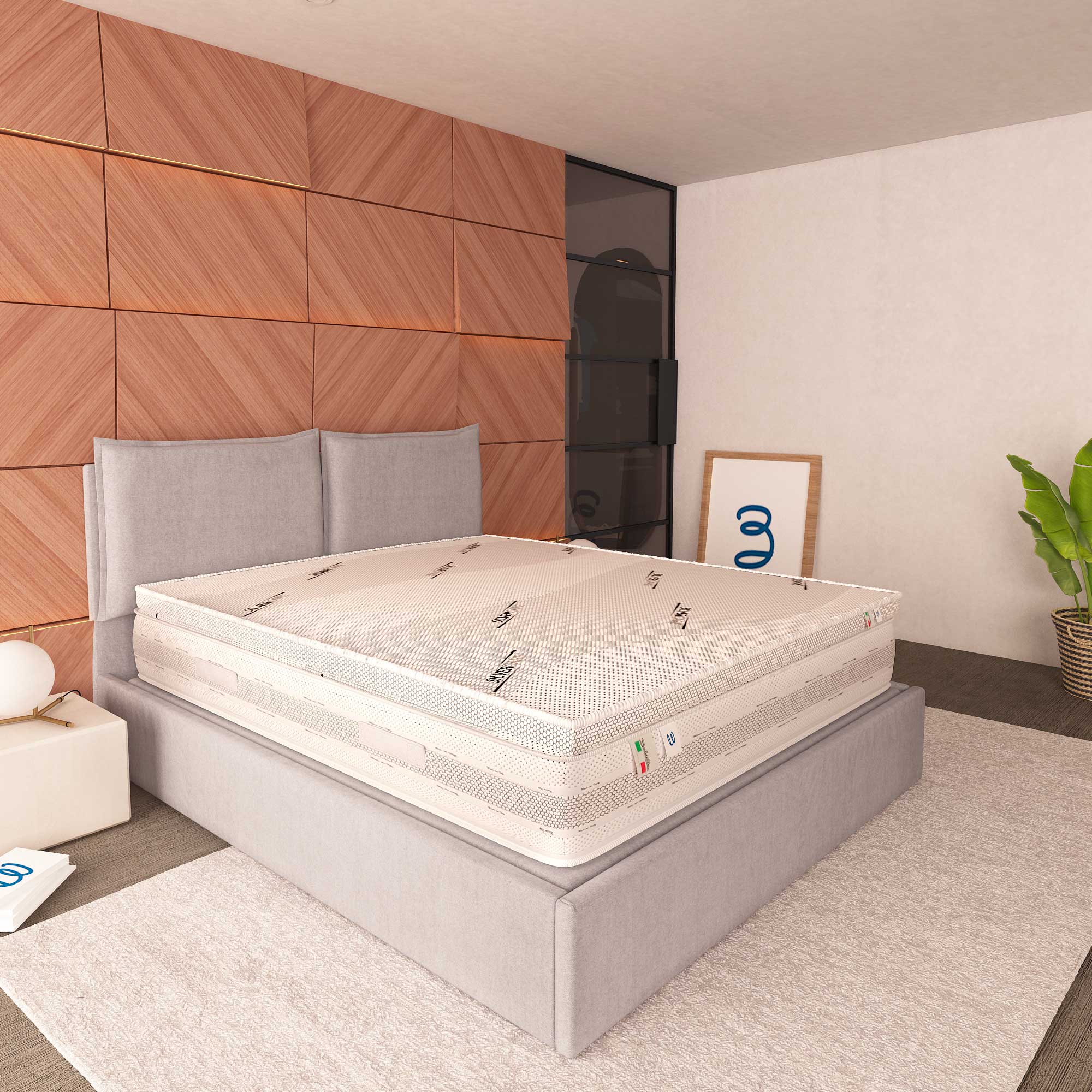 Le matelas Hybrid King Kong est caractérisé par une structure renforcée du caisson à ressorts, adaptée même aux poids lourds du sommeil, mais il est enrichi d'un topper intégré détachable qui ajoute une touche de confort supérieure. Techniquement, sa structure de base se compose d'un caisson de 3000 ressorts ensachés de 3 cm de diamètre, chacun ensaché individuellement pour une meilleure protection du ressort lui-même et pour favoriser sa durabilité dans le temps ainsi que son silence. La couche de ressorts accueille parfaitement la forme du corps et pour maximiser sa rigidité, ils sont contenus dans un caisson constitué d'un polyuréthane haute densité résistant qui garantit une performance impeccable dans le temps, en conservant son indéformabilité même soumis à de fortes sollicitations. Le matelas King Kong est idéal pour ceux qui recherchent un matelas rigide sans compromis et qui suit parfaitement la forme de leur corps.