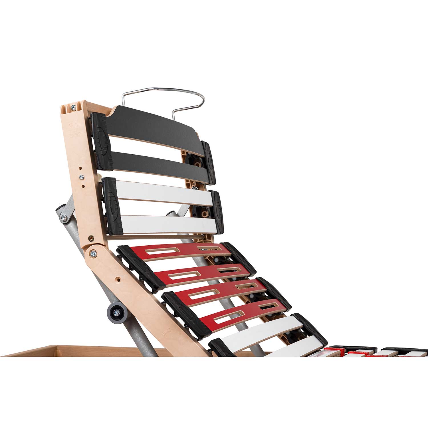 Quatre lattes alvéolées dans la zone des épaules garantissent une respirabilité maximale dans l'une des zones les plus critiques pendant le repos. Les supports de lattes en SEBS® haute densité uniformisent la surface de couchage. Ce sommier est un produit certifié comme dispositif médical de classe 1 selon la directive 2007/47/CE et est déductible à 19 % en tant que dépense de santé.