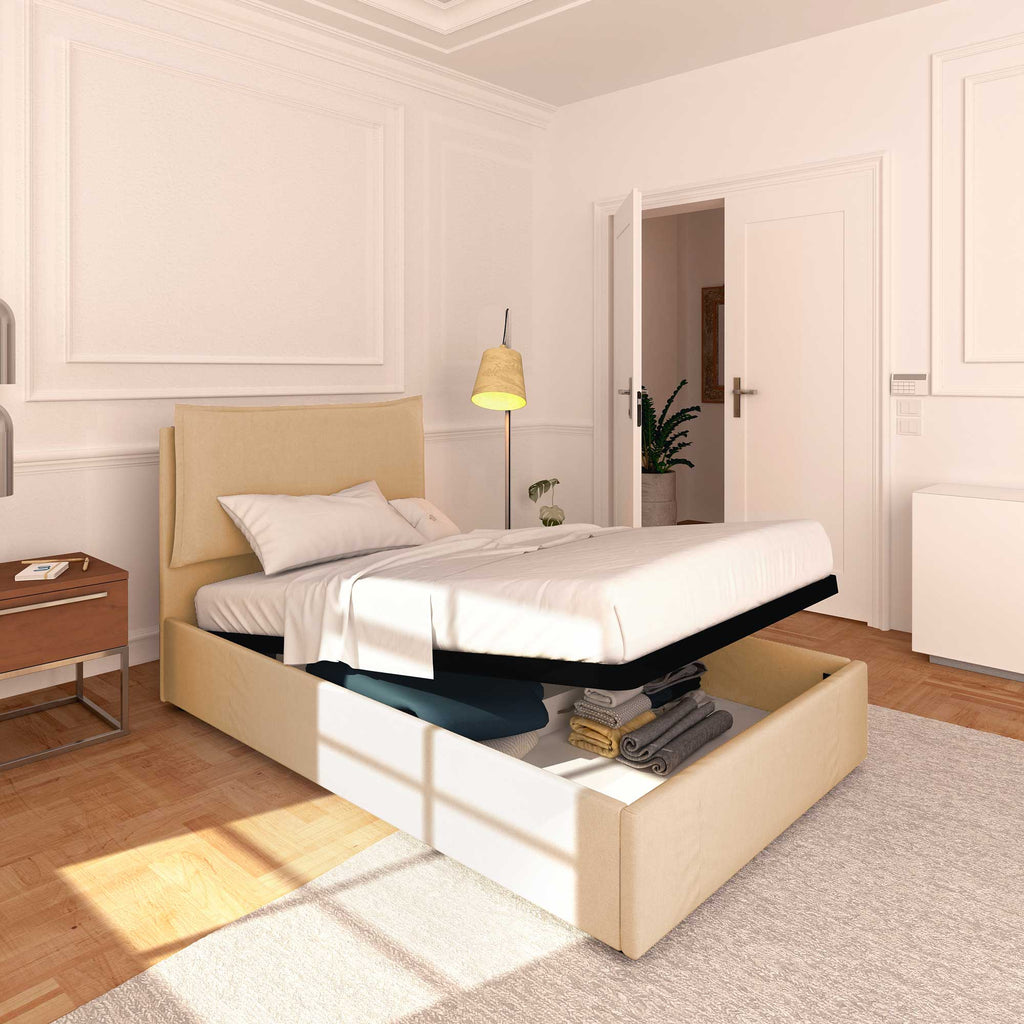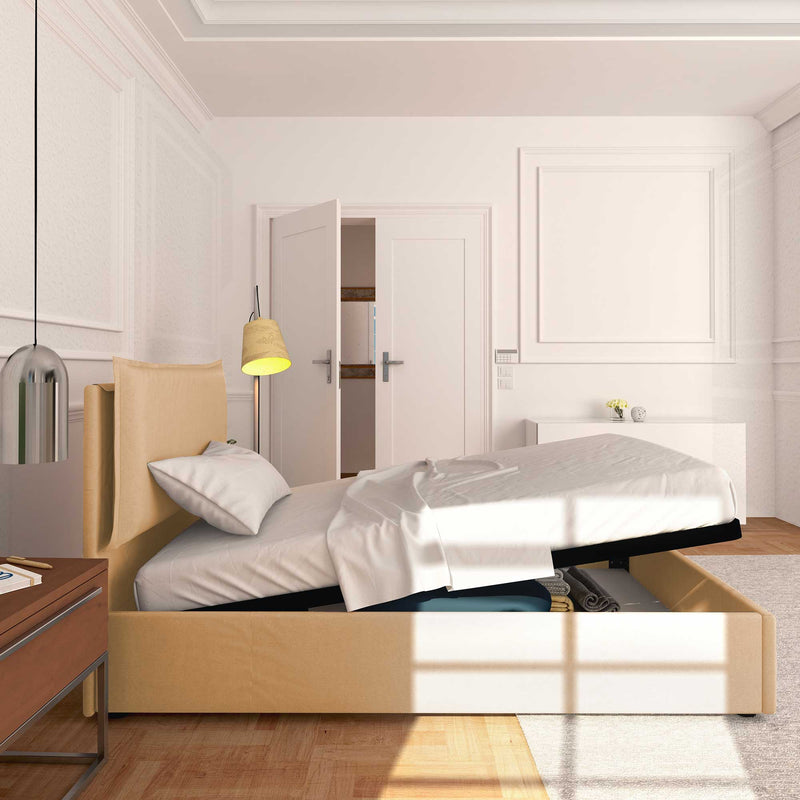 Letto contenitore una piazza e mezza in ecopelle ignifugo sfoderabile Monet